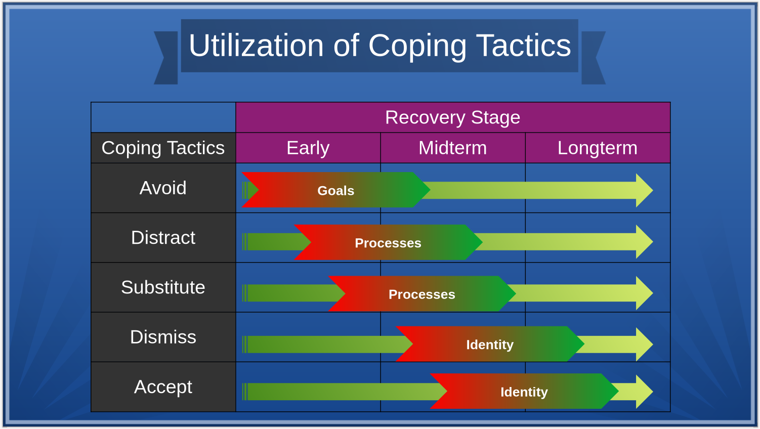 Here is a presentation slide that I put together that tries to convey which types of coping tactics I used the most as I recovered from each particular habit that I wanted to change.
